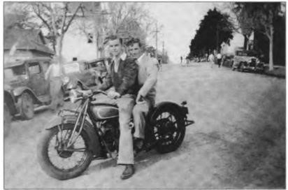 (picture – Gene traveled far and wide, often with Ben Reed or Dudley Dexter, on his little red motorcycle. Circa 1934 at 209 Crocker Avenue, Piedmont.)